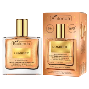 Bielenda Lumiere to suchy olejek z drobinkami złota, który łączy pielęgnację skóry i włosów w lekkiej, szybko wchłaniającej się formule. Zawiera 99% składników pochodzenia naturalnego, intensywnie nawilża, odżywia i wygładza bez efektu tłustości. Formuła oparta na 10 olejkach roślinnych wspiera regenerację, elastyczność i zdrowy blask. Może być stosowany na twarz, ciało i włosy.