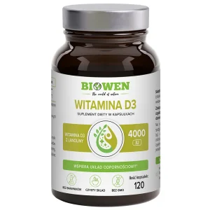 Witamina D3 Biowen to suplement diety zawierający naturalną witaminę D3 pozyskaną z lanoliny i rozpuszczoną w oliwie z oliwek dla lepszej przyswajalności. Opakowanie wystarczy na 120 dni stosowania.