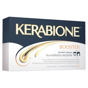 Kerabione Booster to suplement diety w kapsułkach zawierający m.in. kwasy omega-3, ekstrakt z palmy sabałowej, olej z wiesiołka oraz witaminy A i E i miedź. Wspiera wzrost włosów, ich pigmentację oraz chroni komórki przed stresem oksydacyjnym. Składniki zawarte w preparacie pomagają także utrzymać zdrową skórę głowy, co przekłada się na zdrowe i mocne włosy.