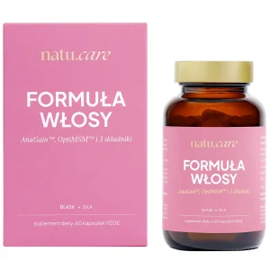 Natu.Care Formuła Włosy to suplement diety dla dorosłych, zawierający m.in. miedź, AnaGain™, OptiMSM™, keratynę i olej z pestek dyni, wspierające kondycję włosów. Wegańska formuła łączy składniki mineralne, roślinne i strukturalne, bez glutenu, laktozy i konserwantów. Produkt pomaga m.in. w utrzymaniu pigmentacji włosów oraz ochronie komórek przed stresem oksydacyjnym. Zaleca się stosowanie 2 kapsułek dziennie, a jedno opakowanie wystarcza na 30 dni suplementacji.