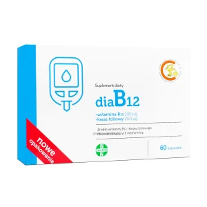 DiaB12 to suplement diety łączący witaminę B12 (cyjanokobalaminę) z kwasem foliowym, co wyróżnia go na tle prostych preparatów jednoskładnikowych. Produkt został opracowany z myślą o osobach dorosłych, które chcą uzupełnić codzienną dietę w te dwa składniki, szczególnie jeśli ich zasoby w organizmie mogą być obniżone, np. przy stosowaniu leków wpływających na wchłanianie kobalaminy (IPP, metformina).