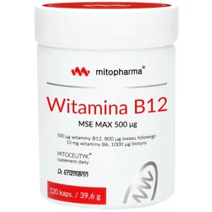 Mito-Pharma Witamina B12 MSE Max to suplement diety zawierający aktywną formę witaminy B12 – metylokobalaminę. Preparat dostarcza wysoką dawkę witaminy B12 (500 µg) w jednej kapsułce, dlatego może być rozważany w sytuacjach zwiększonego zapotrzebowania na kobalaminę. Został dodatkowo wzbogacony o witaminę B6, kwas foliowy w aktywnej postaci oraz biotynę, co sprawia, że formuła oferuje szersze spektrum działania niż standardowe produkty jednoskładnikowe.